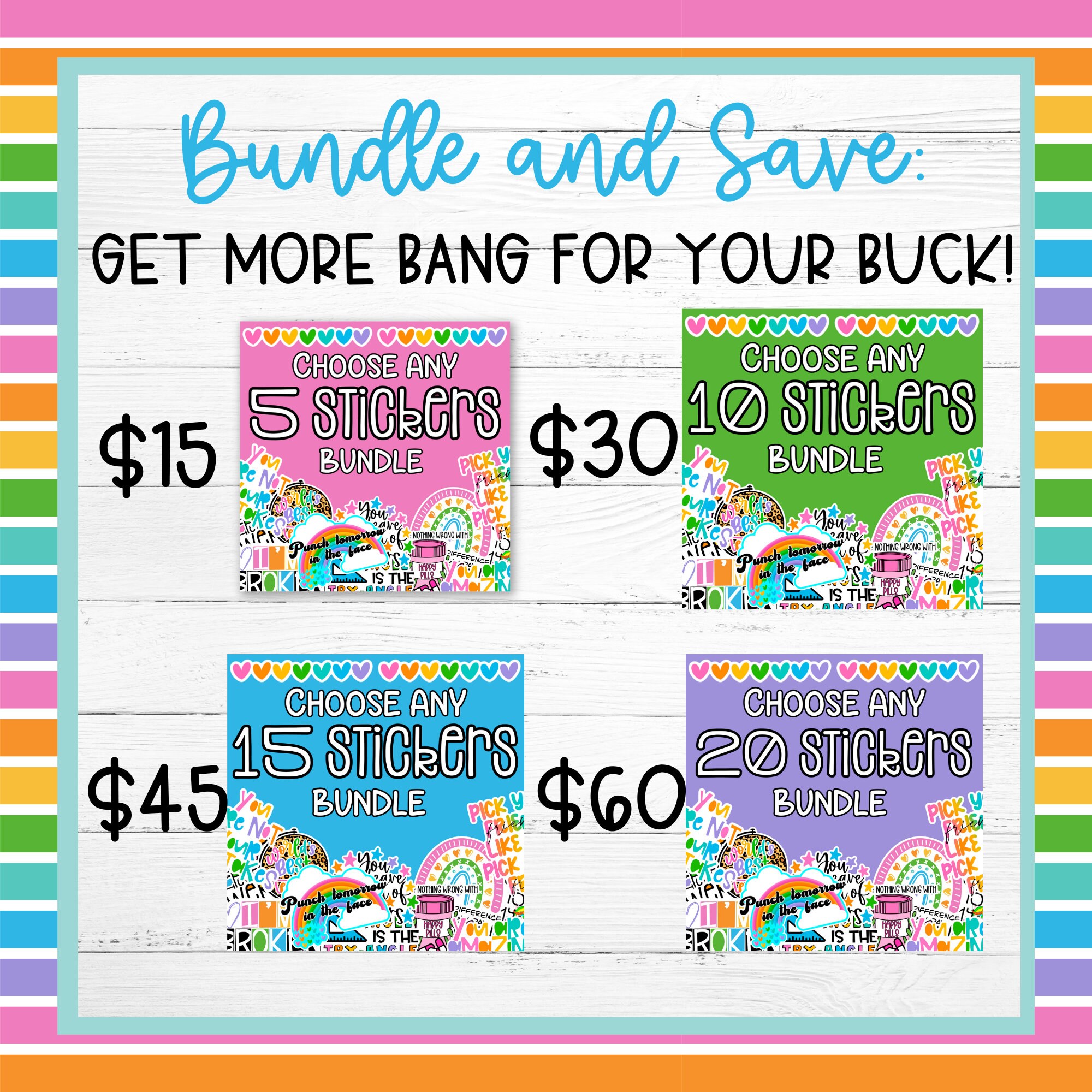 Can’t decide on which stickers to get? Now you can bundle and save! You choose the stickers you want! The more you get the more you save!