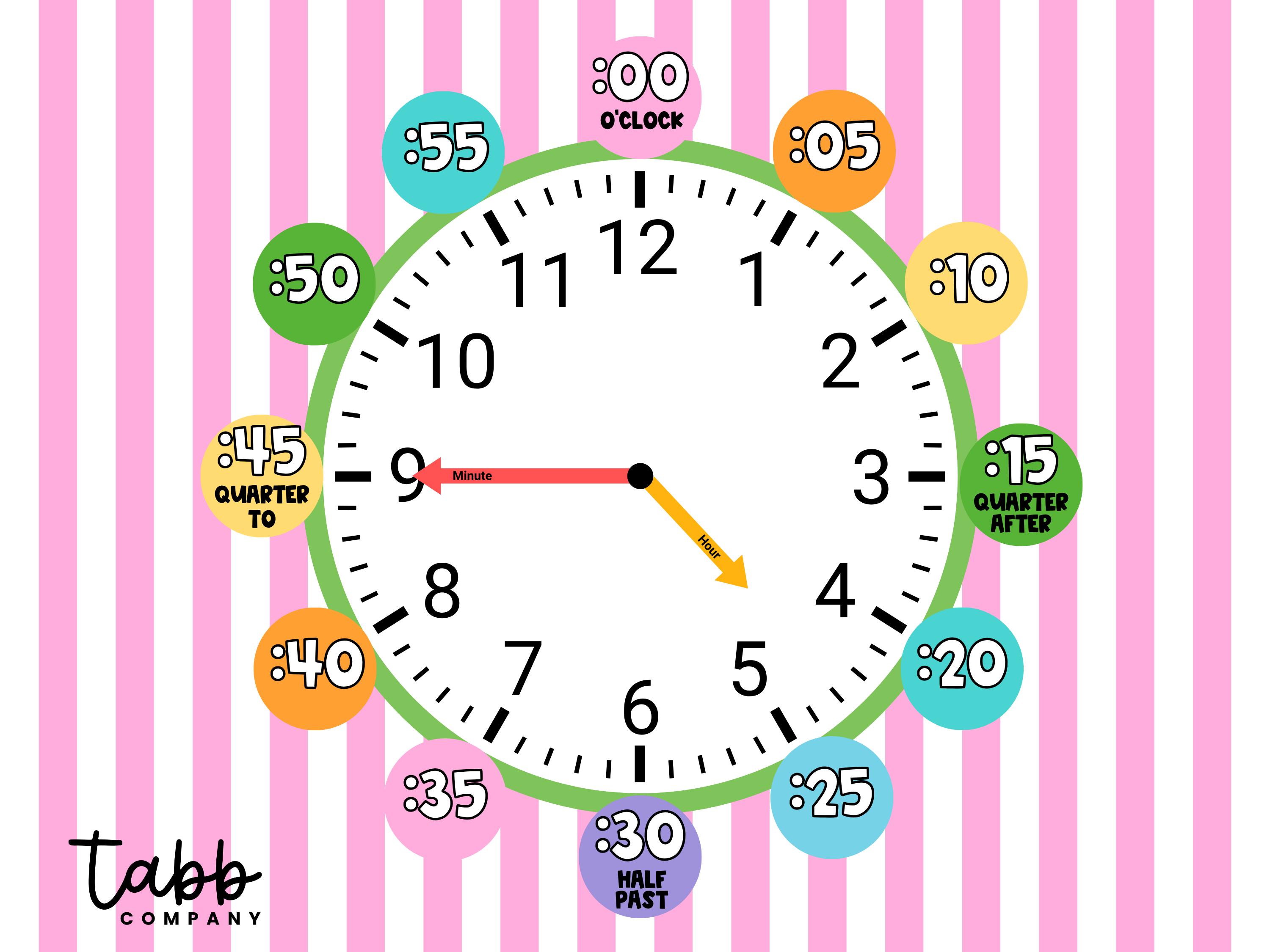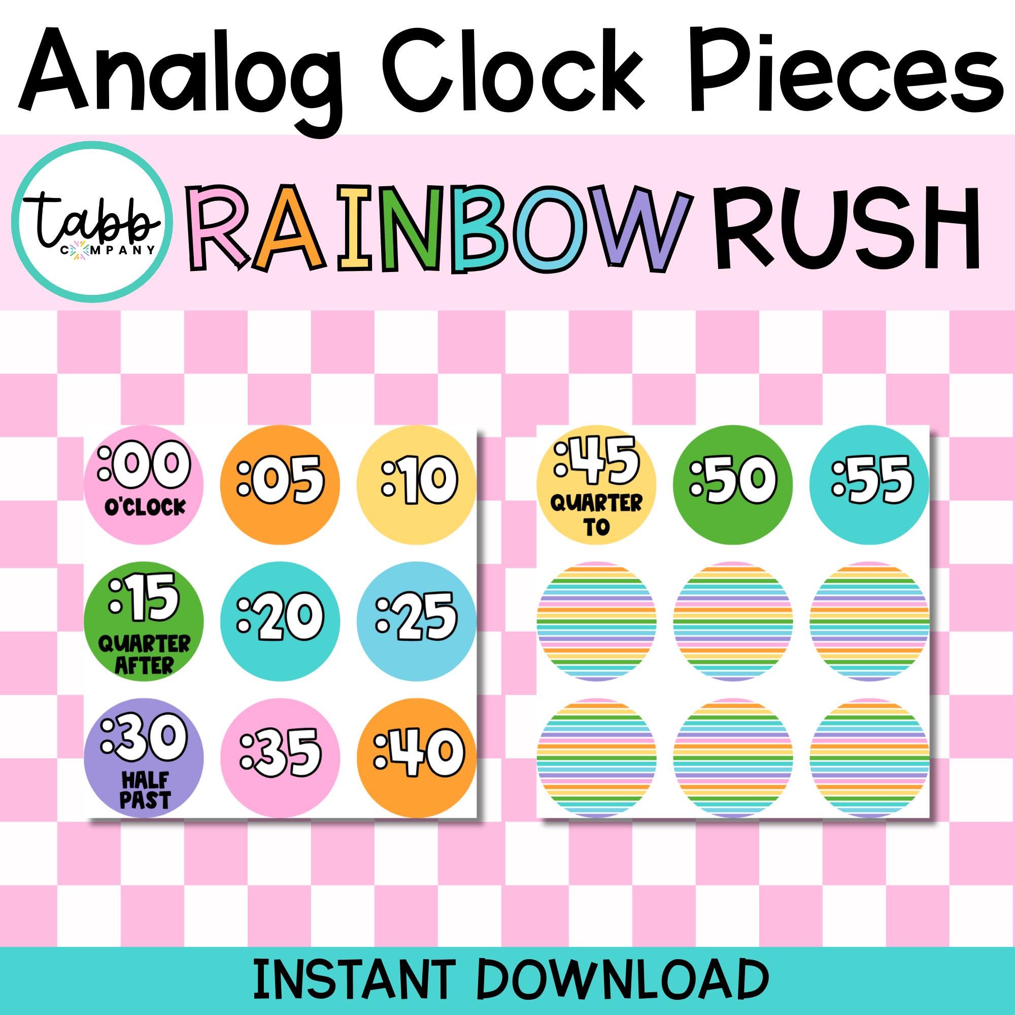 Make learning to tell time easy and fun with these Rainbow Rush Analog Clock Pieces! Designed to fit around your classroom clock, these colorful markers help students visualize minutes, quarters, and half-past times while adding a pop of color to your space.