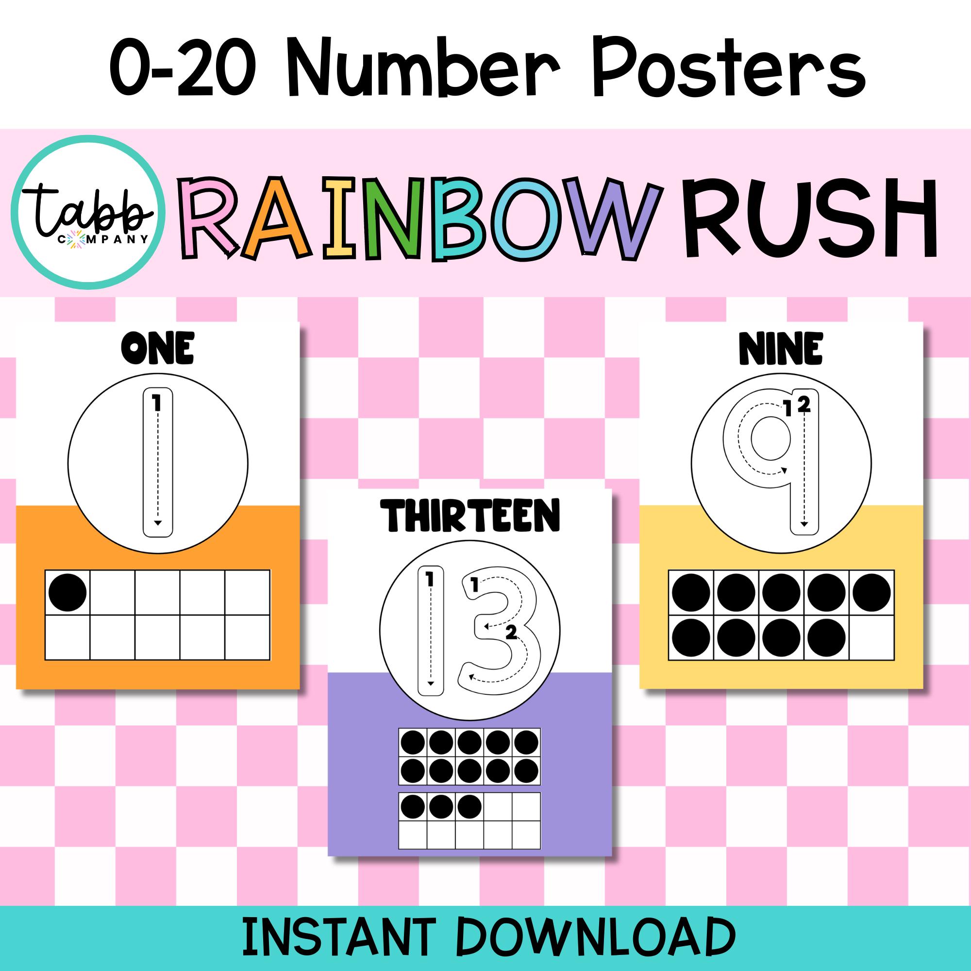 Bring number learning to life with a burst of rainbow magic! 🌈 The Rainbow Rush 0–20 Number Posters make counting, number recognition, and handwriting practice exciting for your little learners.