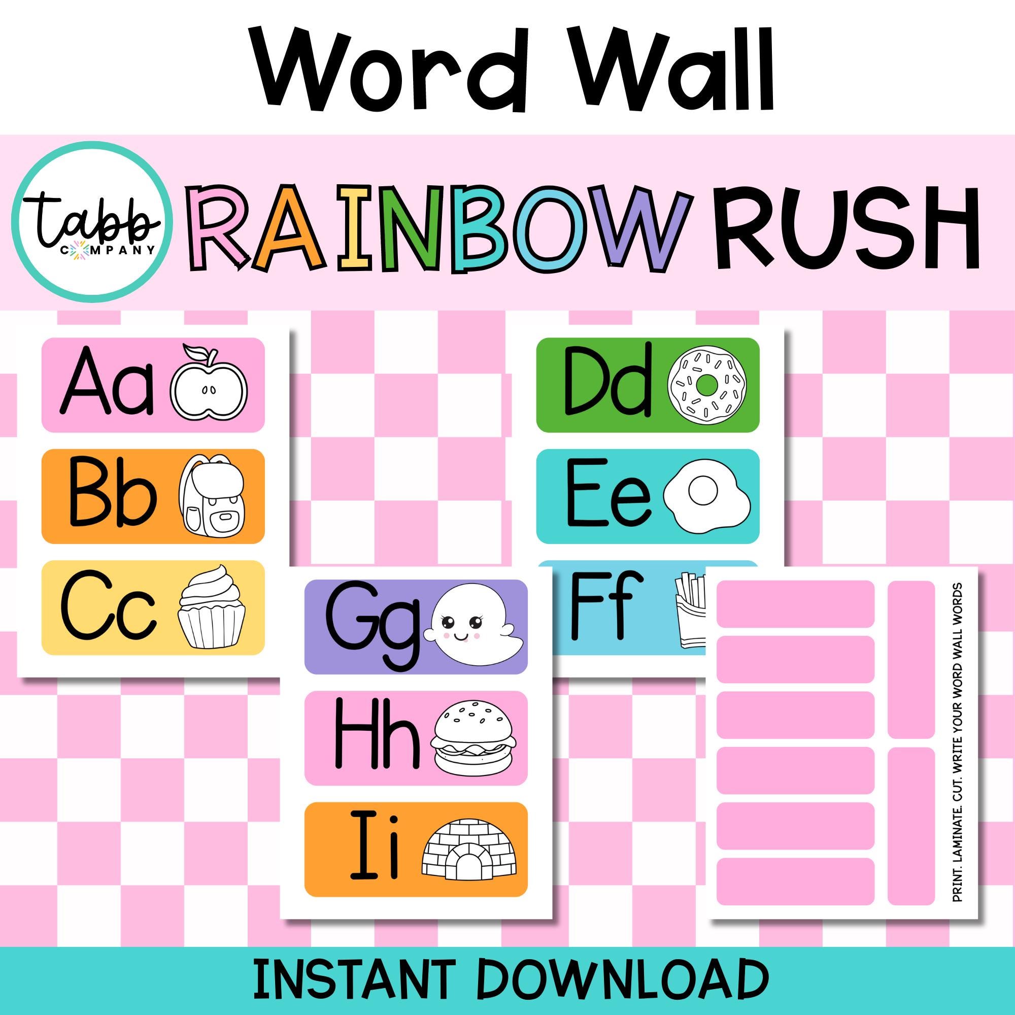 Make your word wall pop with this colorful Rainbow Rush set! Designed for both function and style, this set features A–Z alphabet headers with adorable picture cues for each letter, plus editable word cards so you can customize vocabulary, sight words, and more.